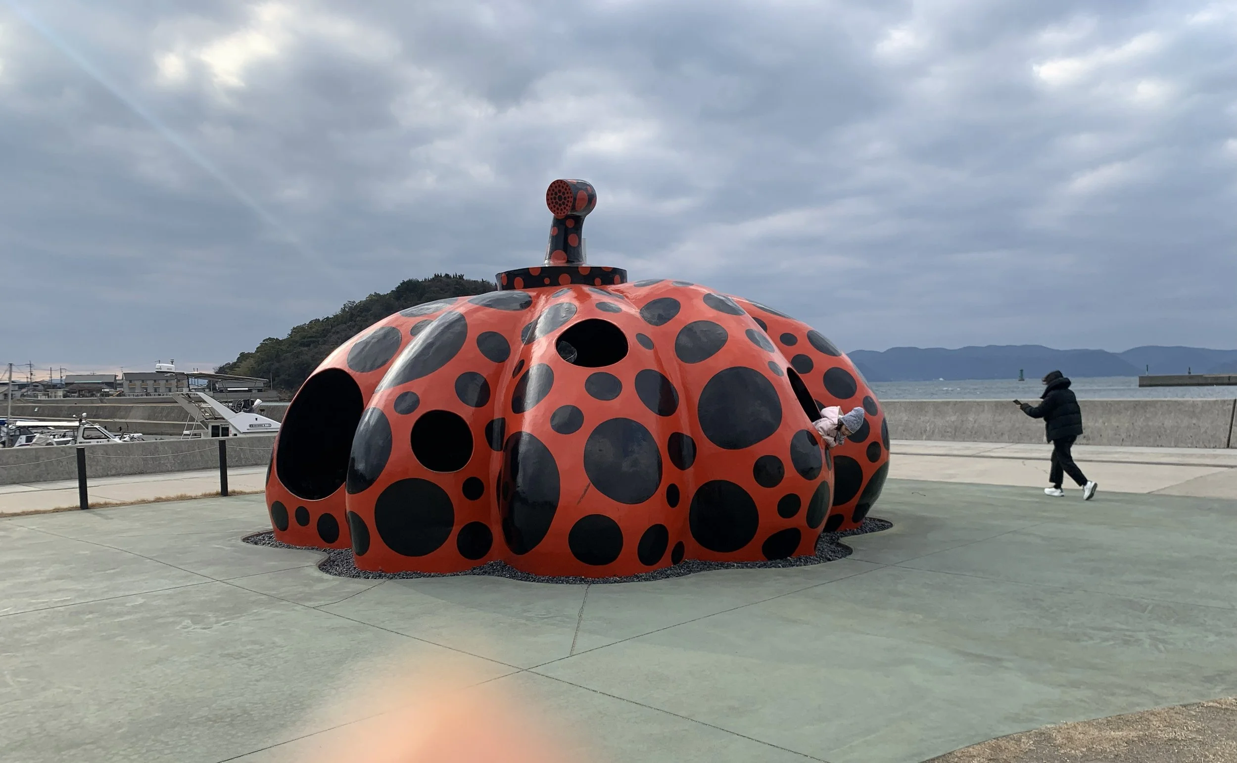 I heard that Kusama used to draw pumpkins so often when she was a child. Her pumpkins seem to represent her love for nature and art and match the environment of Naoshima and Seto Inland Sea. Infinity of her polka dots echoes with vastness of the sea and nature.